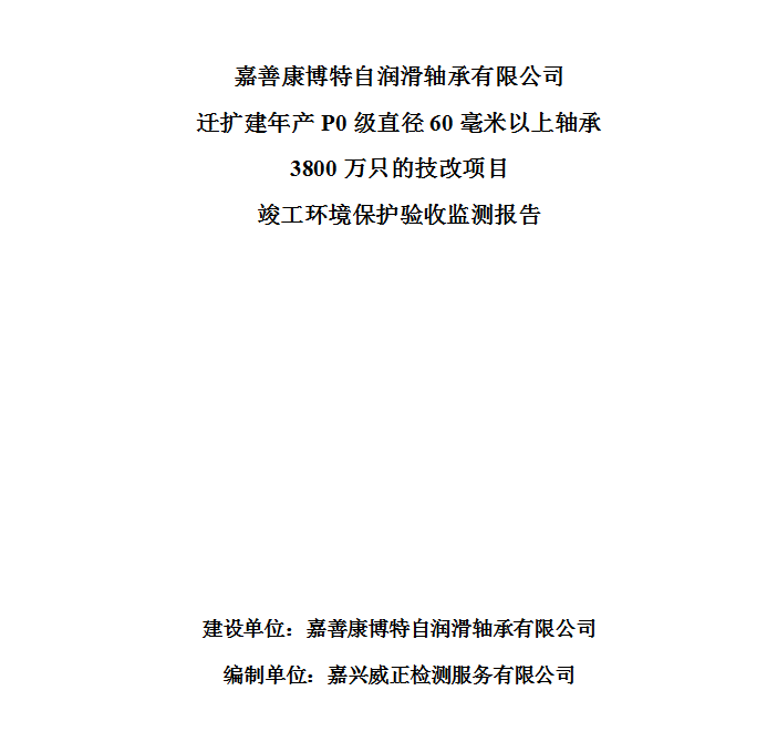 ?嘉善康博特自潤滑軸承有限公司遷擴(kuò)建年產(chǎn)P0級直徑60毫米以上軸承3800萬只的技改項(xiàng)目竣工環(huán)境保護(hù)驗(yàn)收監(jiān)測報(bào)告????????建設(shè)單位:嘉善康博特自潤滑軸承有限公司編制單位:嘉興威正檢測服務(wù)有限公司?
